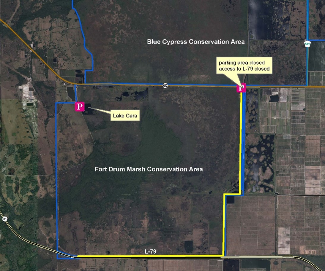 PALATKA, Fla. Feb. 9, 2022 — The east public access point into the Fort Drum Marsh Conservation Area located in Indian River County will be closed weekdays beginning Feb.9 through the end of the month. During this time, Florida Power and Light will be replacing aging power-poles on the south and west sides of the District’s property. The access area will re-open for public use on weekends. As an alternative, visitors can utilize the main entrance located at Lake Cara (shown above) which will remain open throughout construction.