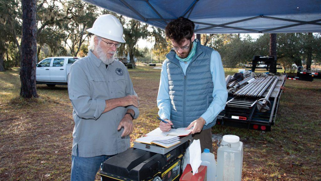 Hydrologist Don Lee (left) and Hydrologic Technician Jordan Orton (right) record valuable field data at a well construction site.